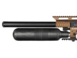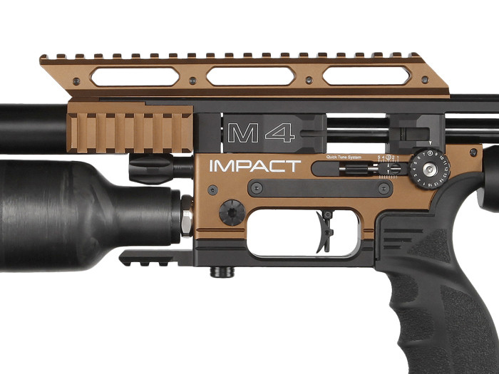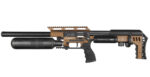 The FX Impact M4 Sniper Edition features a modern tactical design with a striking black and copper finish that enhances its visual appeal. The sleek lines and robust construction not only make it aesthetically pleasing but also contribute to its functionality as a high-performance air rifle.